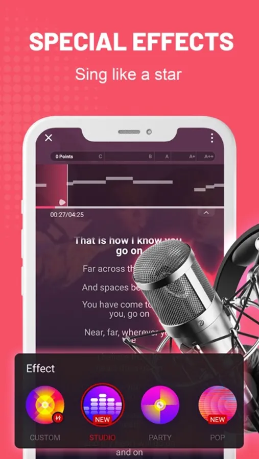 + Record your karaoke recordings with various voice effects like Distant, Warm, Vinyl, Party, Fascinating, etc.