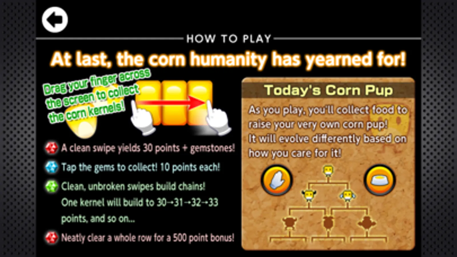 - As you collect corn in the main game, you can use it to raise your pet “corn pup.”