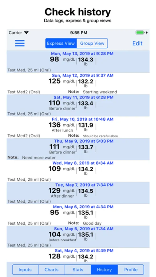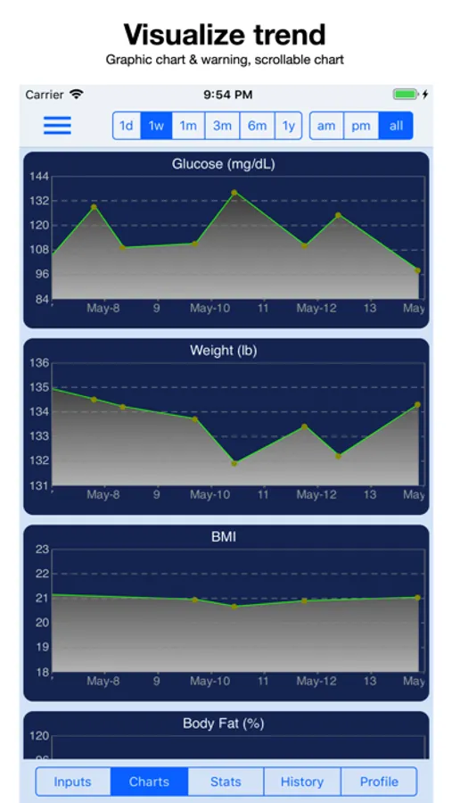 Data Visualization – a chart is worth a thousand words. The graphical charts give you a visual trend of the vital signs and show warning signs (BP only).