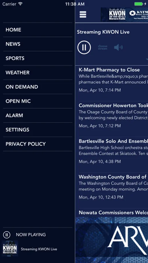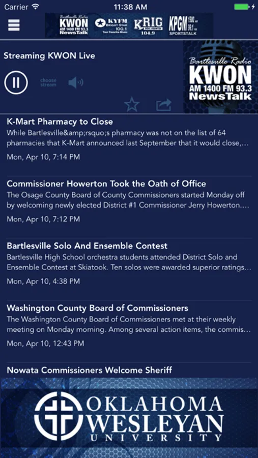 Listen to KWON 1400 AM, KYFM 100.1 FM, KRIG 104.9 FM and KPGM 1500 AM anywhere you go with our iPhone app. Check local news, sports, and community events plus stay in contact with your favorite radio stations in NE Oklahoma and SE Kansas.