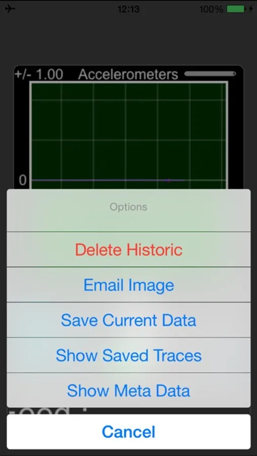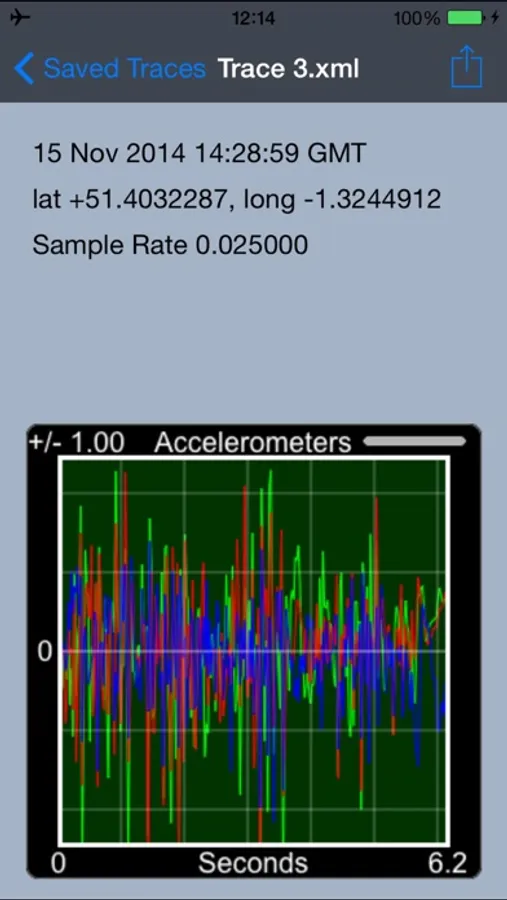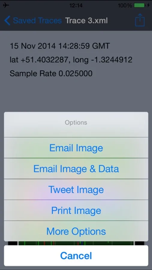 You can also Print or Email an image of the trace, and even email the data itself, in an xml format (annotated xml file format available on request ). The application has a trace viewer page where you can examine the trace in detail, switching on and off individual axis traces by accessing a menu using a swipe up gesture plus zooming in and out or scrolling through the trace.