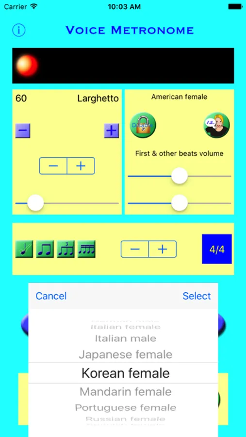 Although there are many metronome apps in the Apps Store, but this one is quite unique, because this apps use a human voice to count the beat. There are total 17 spoken voices in 11 languages to chose from, including languages: English - both American and British, French, Italian, German, Chinese - Mandarin and Cantonese, Spanish, Portuguese, Russian, Japanese, and Korean. Some voices include male and female voices. Beside spoken voices, there is an option to switch to woodblock sound, if you prefer percussive sound.