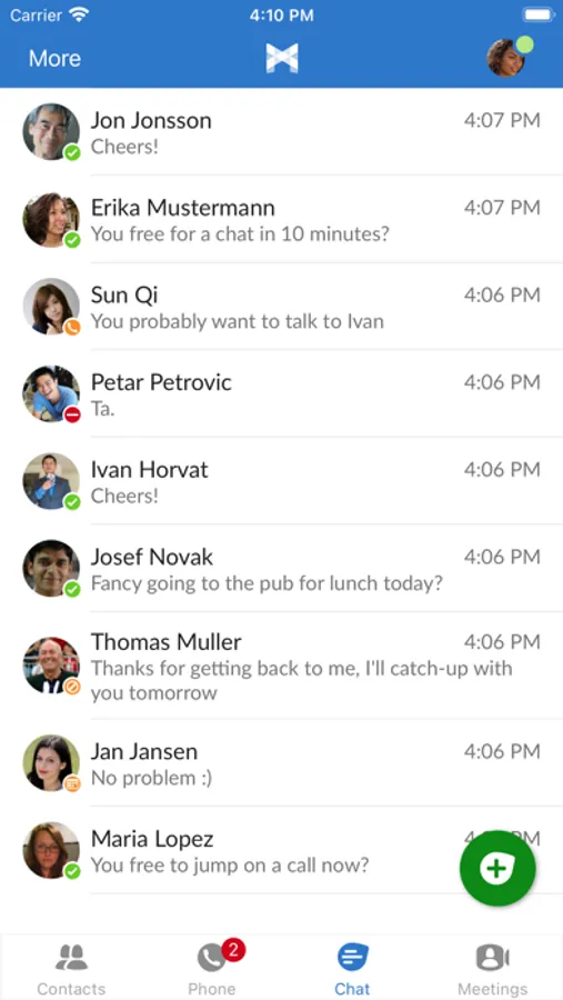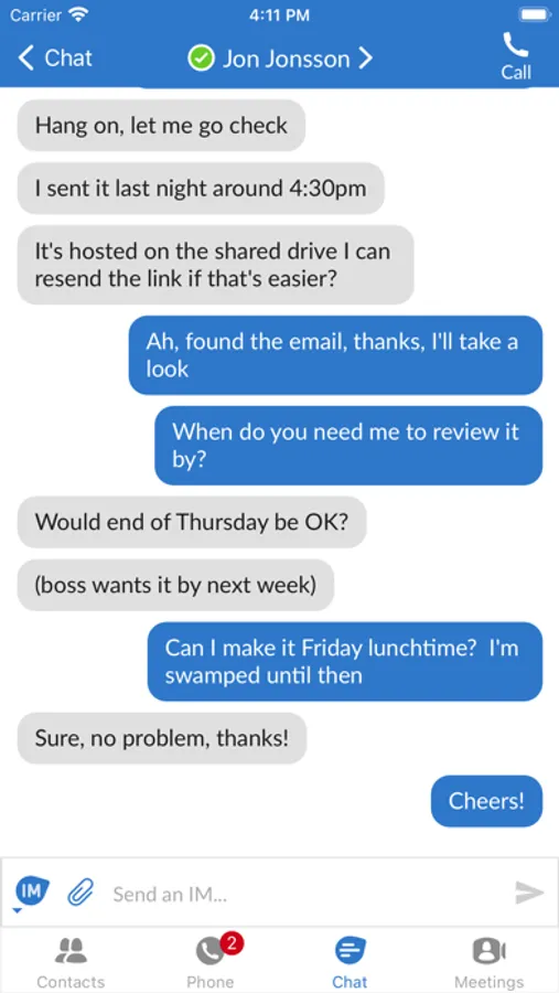- Chat on any device to others in your business, with messages synced across your devices so you can pick up the conversation any time.
