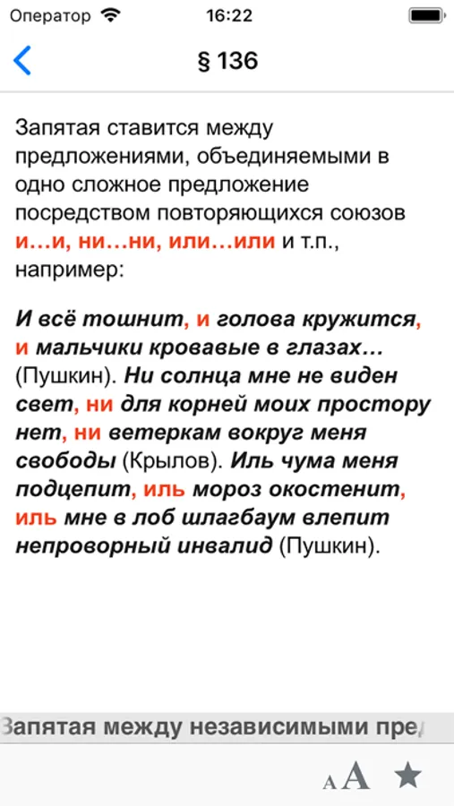 Приложение содержит правила орфографии и пунктуации русского языка. Рассматриваются наиболее часто возникающие вопросы, относящиеся к русскому языку. Все правила доступны без подключения к сети Интернет! В программе присутсвует функция проверки орфографии (требует подключение к сети Интернет). Как использовать эту функцию? Вводите слово с ошибкой, а в ответ получаете варианты правильного написания слова. Элементарно, мгновенно и никаких встроенных покупок. Приятный интерфейс, удобная навигация, огромный набор правил.