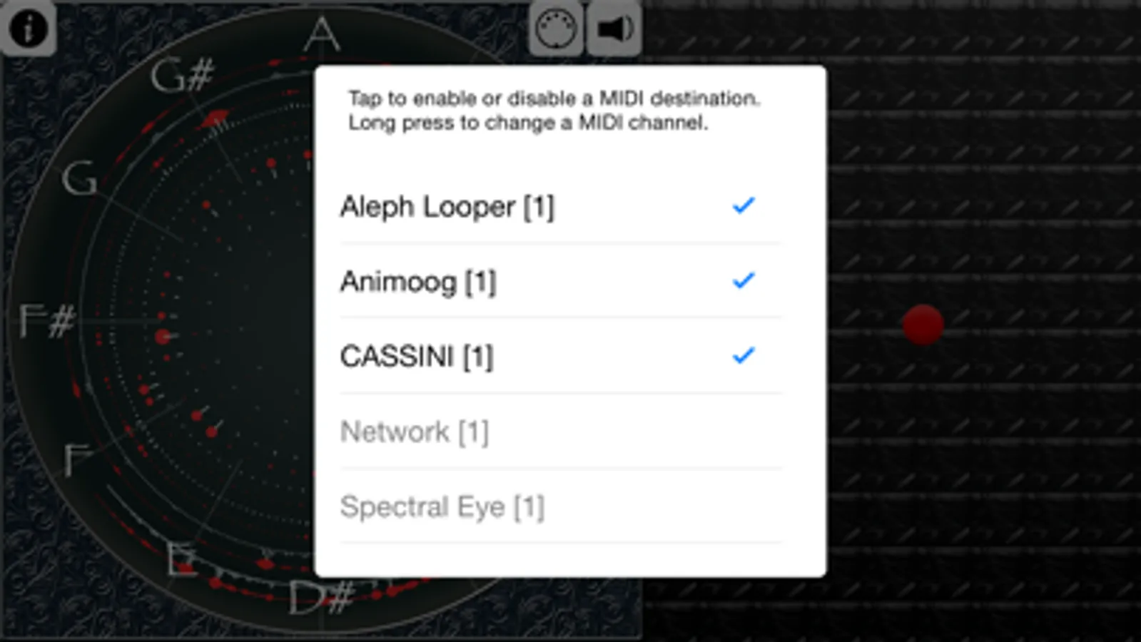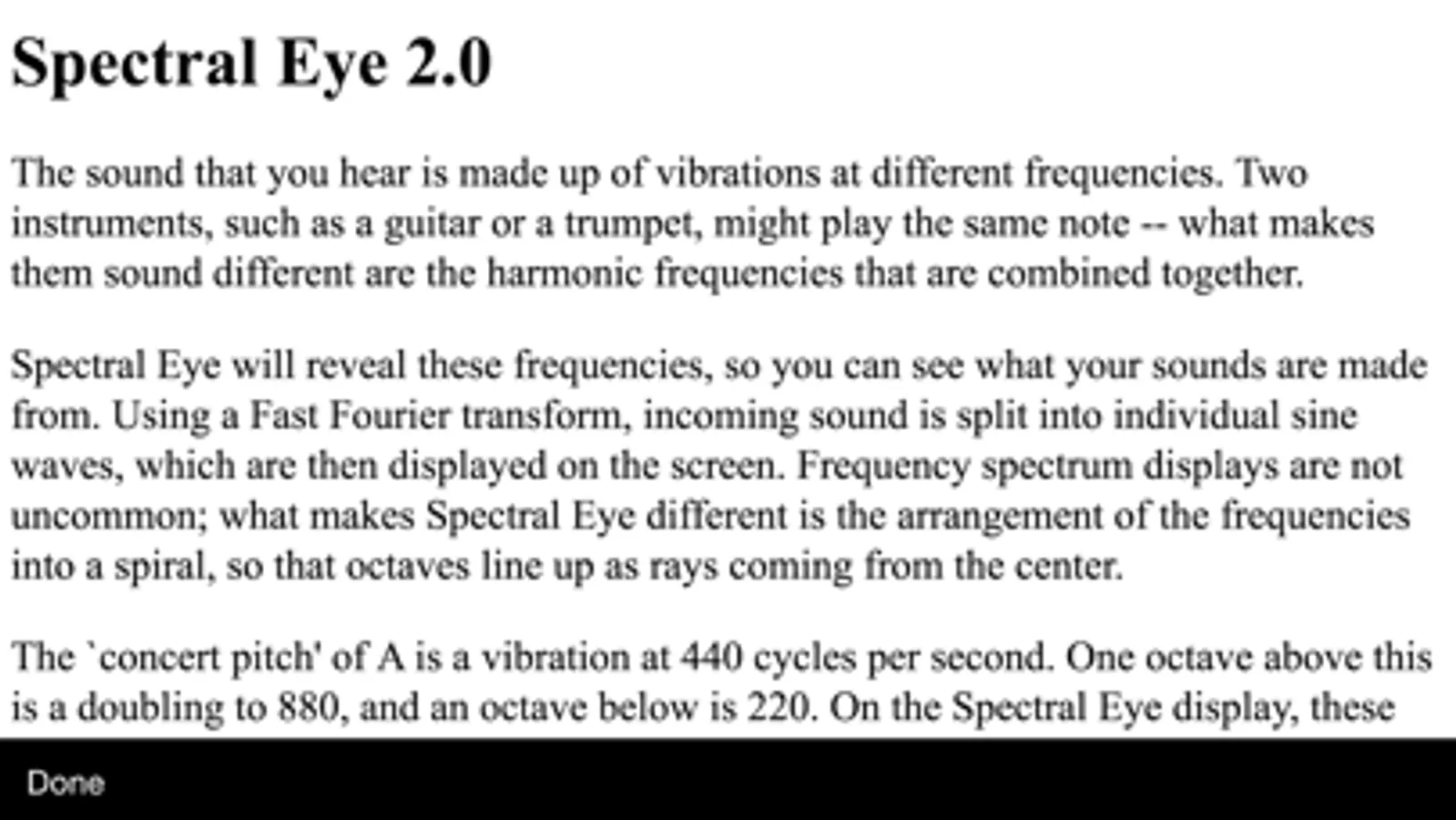 Spectral Eye is free, and will remain that way. No pop-up ads. No nag screen. Just good clean fun. If you like the app, we would very much appreciate a review in the app store. The core technology in Spectral Eye is part of our polyphonic pitch-to-MIDI app MIDImorphosis, which will let you use an ordinary guitar or other instrument to control MIDI synthesizers. This technology is also part of Infinite Looper, our innovative MIDI looping app. We have a number of other music-related apps available; we hope you dig Spectral Eye, and if you want to help us keep good things going, reviews or purchases of our other apps would be awesome!