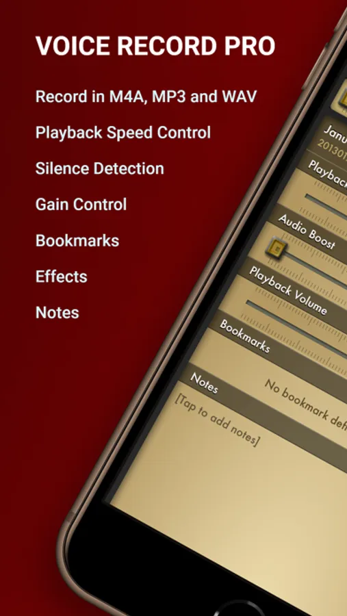 Voice Record Pro is a professional voice recorder. It allows you to record voice memos and on-site sounds at unlimited length with configurable quality.