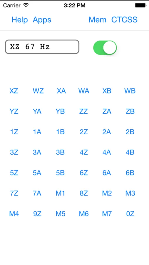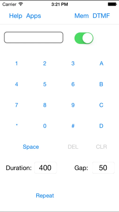 You can also store commonly used tone sequences. Tap on the Mem button to bring of the list of memory entries, which will by empty at first. To add an entry, tap the Edit button, then the green plus sign to add an entry, which will get a default name of Untitled. Tap Done, then tap on the Untitled entry to edit it. You can change the name, as well as the tone keys to be sent. To send an entry, tap the send button. It will be sent (or stored in the buffer if the switch is off). It will also be placed in the repeat buffer, so you can tap RPT/Repeat to re-send it.