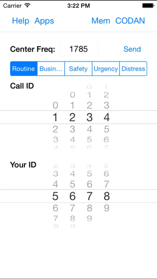 In CODAN mode, adjust the center frequency if necessary, select the priority of the message, and dial in the ID to call, and your ID. Then tap Send.