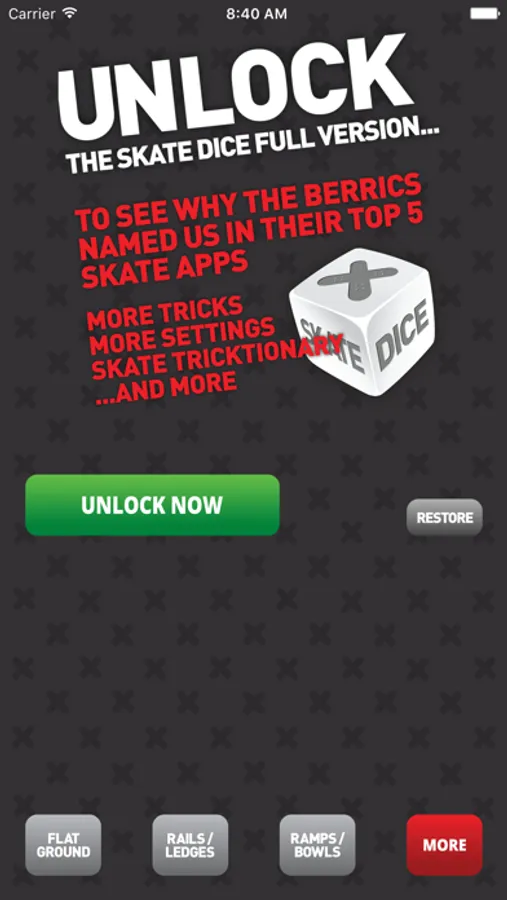 Skateboarding is an extreme sport which can sometime results in injuries and even death. Send It! Apps / Hollis Group Ltd. and the 'SKATE DICE' staff are not legally liable for any accidents that might occur while trying the tricks the 'SKATE DICE' App suggests. If you do not feel comfortable trying a 'SKATE DICE' trick, PLEASE DO NOT TRY IT! The 'SKATE DICE' App is a progression tool, not an excuse to try something you aren't ready for. Practice Smart Style, always wear a helmet and ride to your ability level. By choosing to buy this app you agree to these warnings.