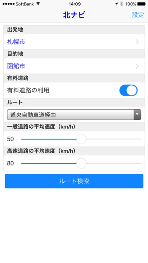 この『北ナビ』は、「渋滞がめったにない」「都市部を抜ければ信号がほとんどない」という北海道の道路交通事情、つまり移動距離さえ分かれば所要時間がほぼ推測できるという特長を生かし、出発地と目的地、平均速度を設定するだけで、ルート、移動距離、所要時間を算出するアプリです。
