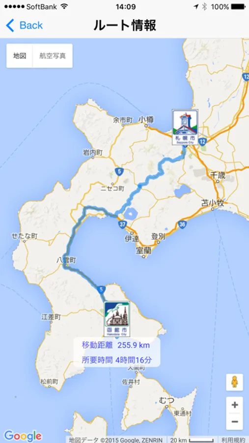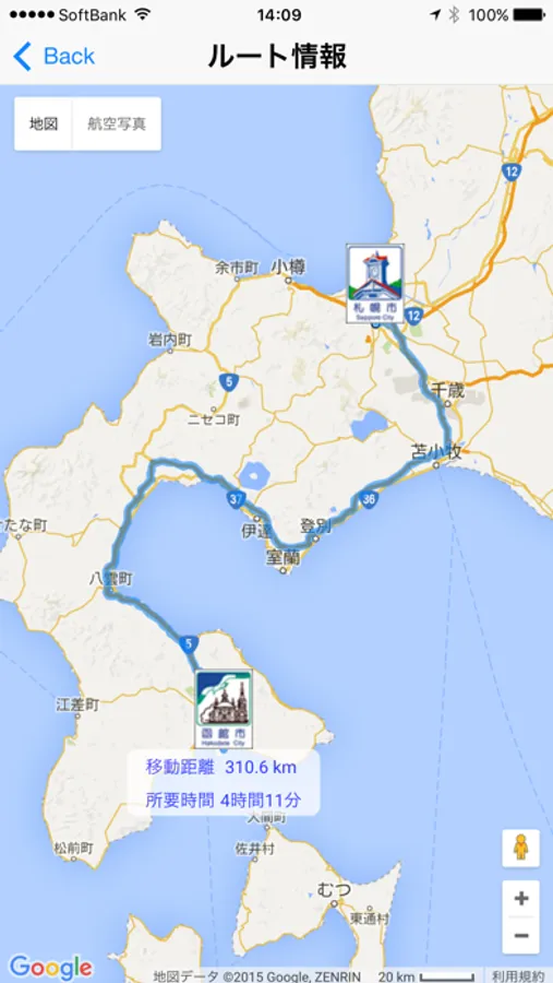 「ルート情報」ボタンをタップすると、ルート・移動距離・所要時間が表示されます。