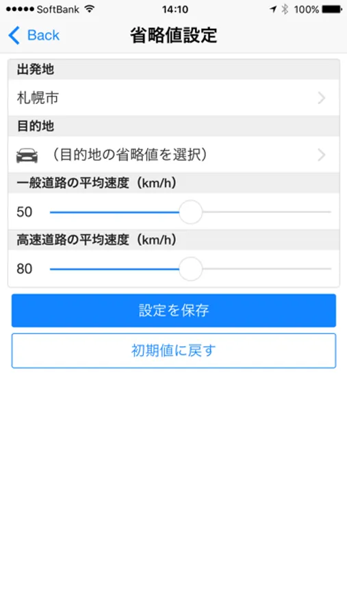 出発地・目的地、一般道路・高速道路の平均速度の省略値を、あらかじめ設定・保存しておくことができます。