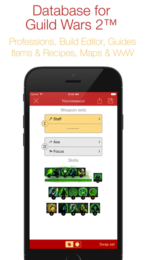 Create your builds, save and load them. Choose you weapon sets, traits, skills and learn them, with details.