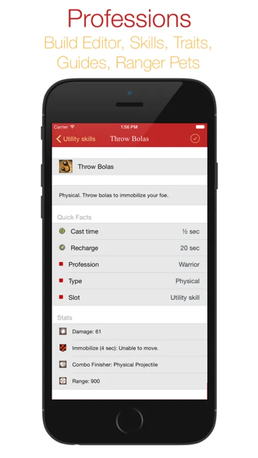 We put all skills and traits of the game in our app, for each profession, for each weapon. With fully skill description and image. So you can learn how this skill works, and view all its stats like: damage, area of effect, recharge time, range, duration, combo finisher etc.