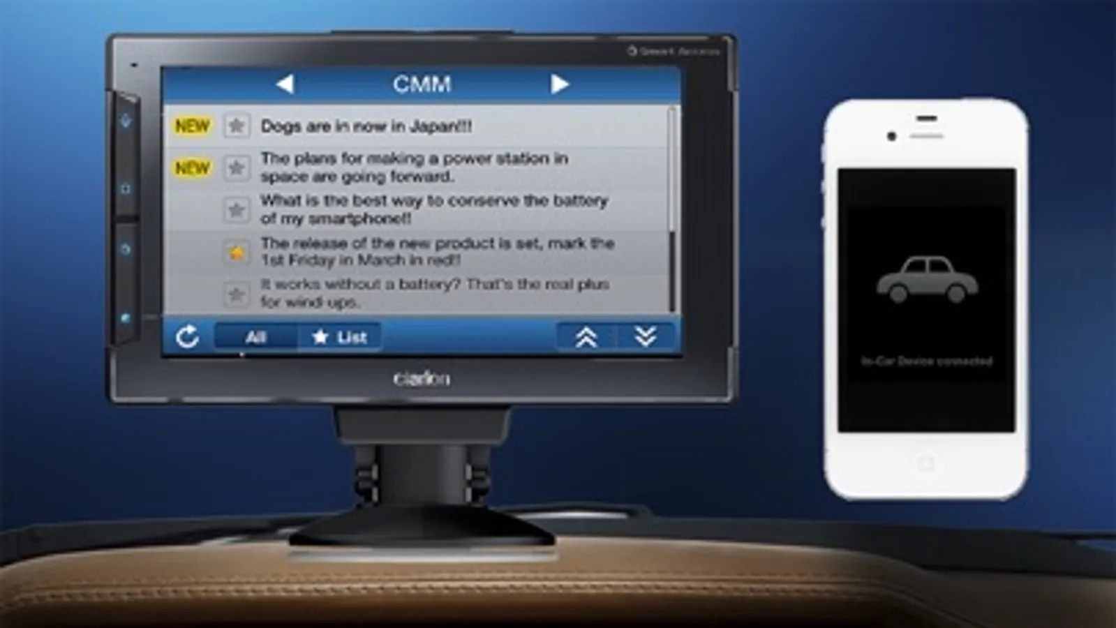 This application is a utility app that integrates useful information for Clarion in-car devices. Information includes News4car, Calendar4car which are fully designed for in-vehicle use. Users can safely access and use every functionality through an UI that minimizes driver distraction.