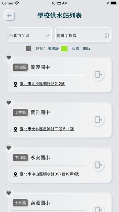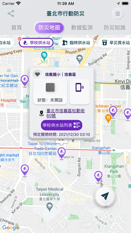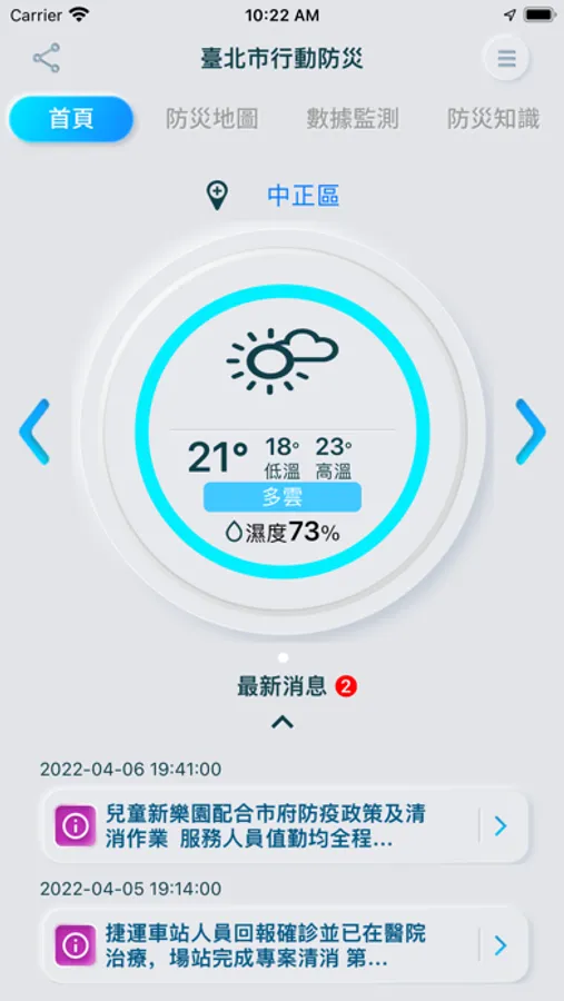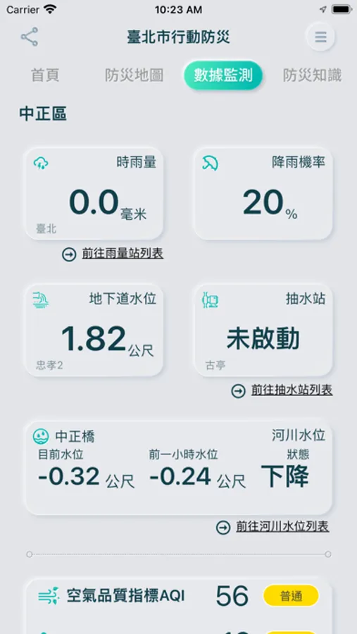 臺北市行動防災App除了可掌握即時的天氣資訊(雨量、水情及颱風警報)、停班停課資訊、監控影像、醫療院所、防災公園及防災地圖等緊急避難資訊,亦新增本市災情案件查詢及展示功能,提供本民眾掌握即時災況,同時也設計了「關注資訊」功能,可自由選訂所需的資訊,並使用顏色區分降雨強度,以更直覺的方式顯示及判別降雨量之大小,並達到提醒之功能。