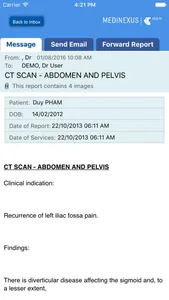 Medinexus Mobile allows you to view reports sent to you as well as view the associated key images or attachments by clicking on the 'View Images' button at the bottom of each report. You are able to forward reports to other registered users by selecting the Forward Tab when you are viewing a report and choosing a user to forward it to.