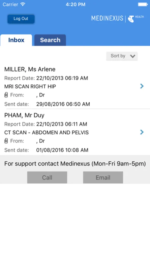The Inbox will show all unread reports and reports that you viewed less than 24 hours ago. If you wish to view a report not in the Inbox (already read) click on the Search Tab next to the Inbox tab and you will be able to search for specific reports. The Inbox shows the same information as the browser based Medinexus web portal shows.