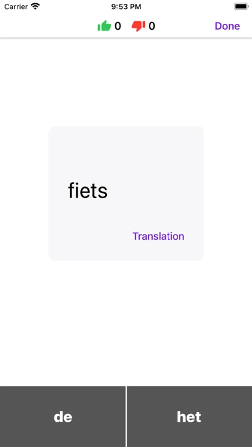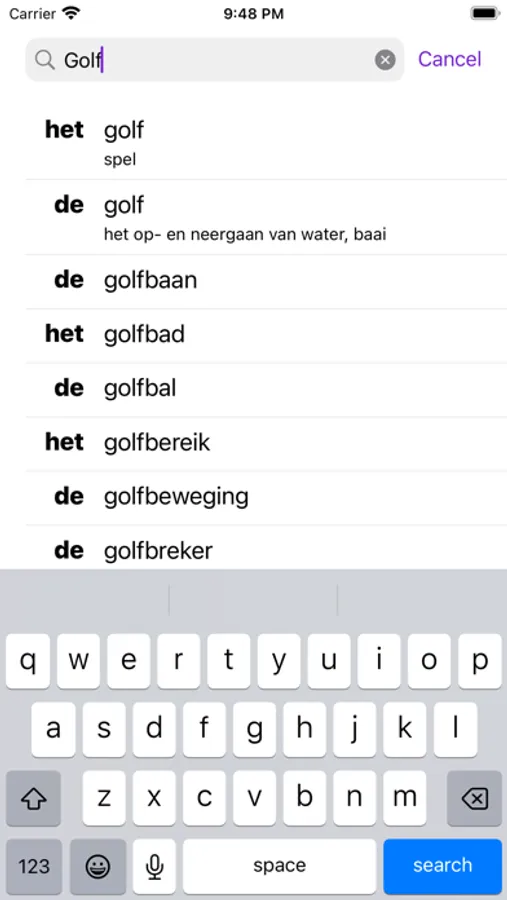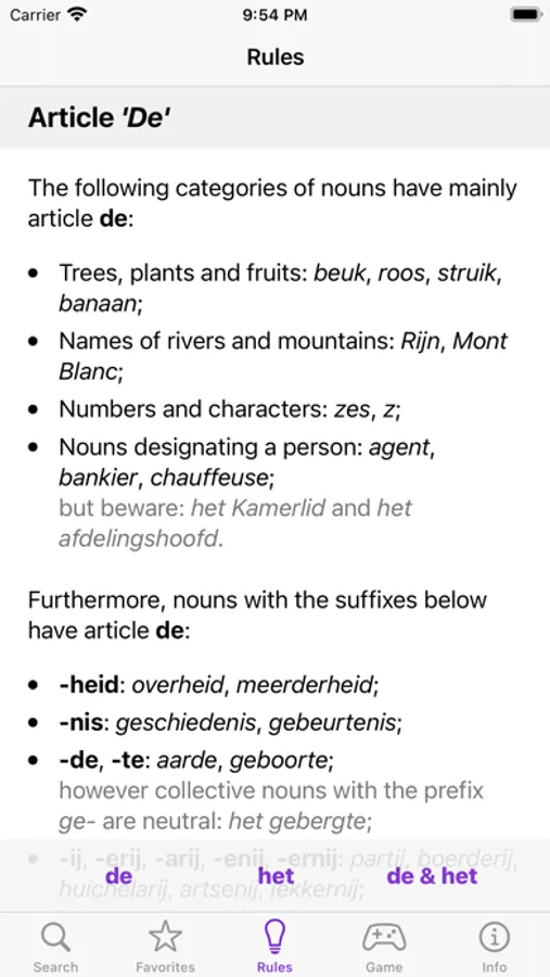 Type the first few characters of a noun and see the article immediately. The app contains a dictionary with more than 73,000 nouns. Optionally, you can display the definition of the noun.
