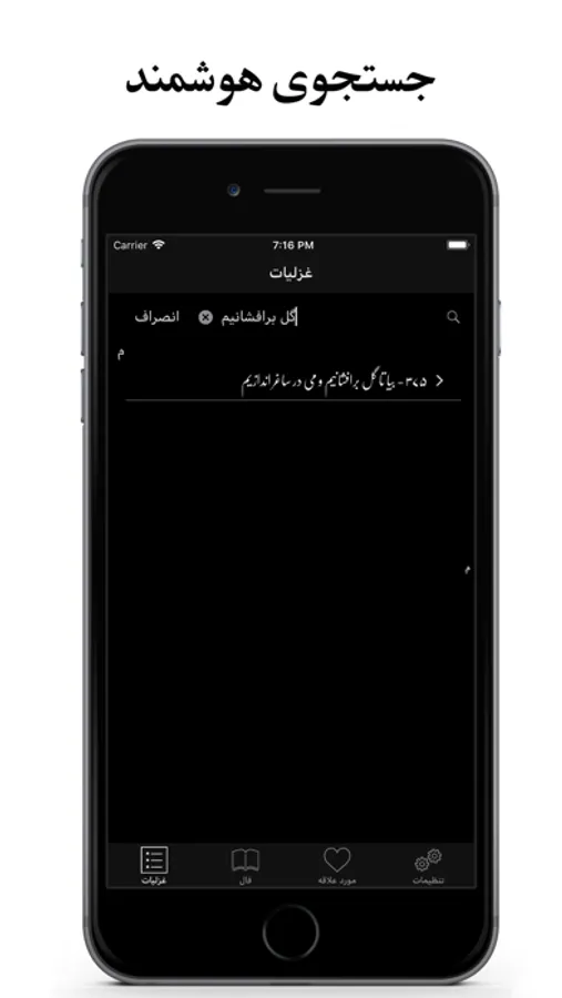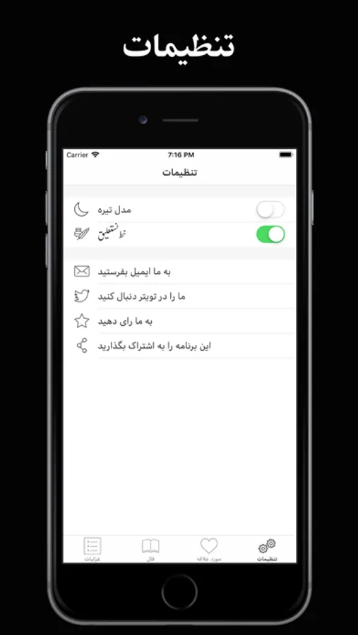 شما همچنین میتوانید اشعار مورد علاقه خود را برای دسترسی سریع و آسان نشانه گذاری کرده و یا از طریق ایمیل و پیامک با دوستان خود به اشتراک بگذارید. به علاوه، با استفاده از دکمه تنظیمات در این اپپلیکیشن، شما میتوانید نحوه نگارش اشعار را به نستعلیق تغییر داده و صفحه پس زمینه را با به سلیقه خود تیره یا روشن کنید.