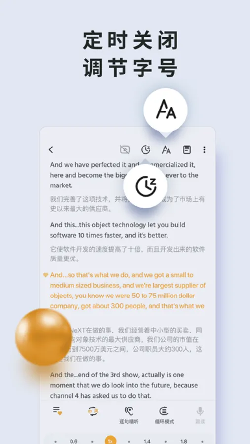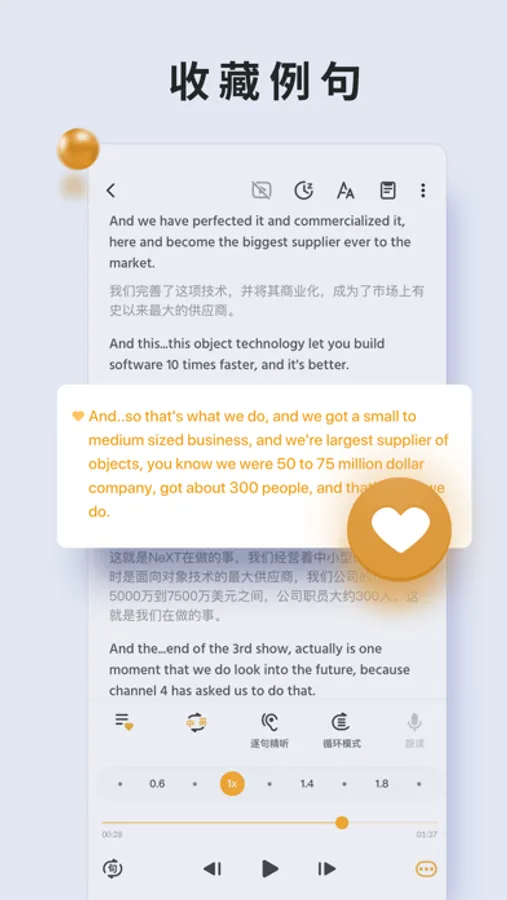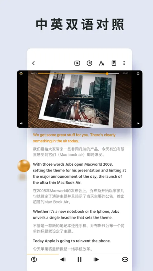 音视频课程均配有中英同步课文,还可切换为单语/无课文模式练习听写和翻译