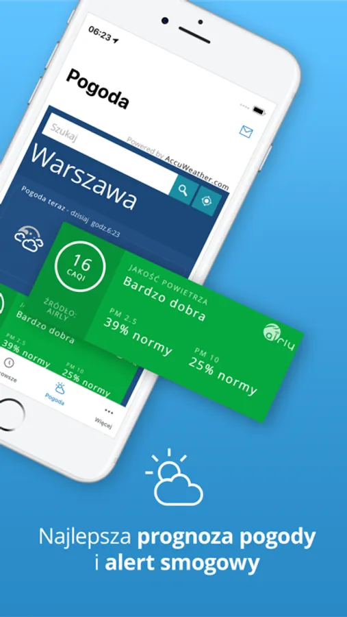 Aktualna prognoza pogody, 3 miliony miejsc na świecie. Aktualizacja prognozy co 30 min. Zawiera także aktualne dane o jakości powietrza.