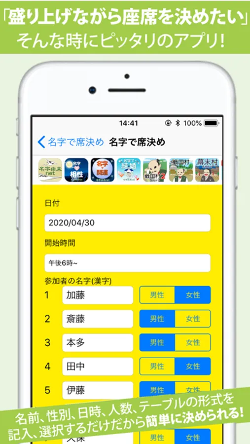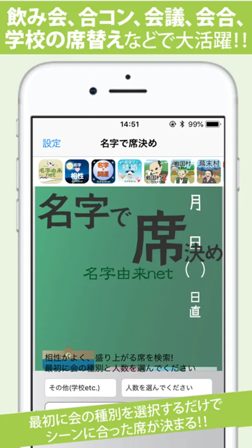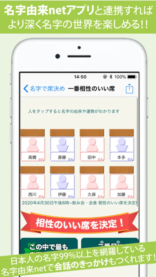 ・「名字で席決め(無料)」アプリは、日本初、名字で相性を診断し座席を決定する座席相性アプリです。飲み会や会合、学校など複数人数の座席を決める機会は意外に多いものです。ビジネスの場では最初の話のきっかけづくり。初めて同士の人でもクラスメートや知人同士でも「座席の場所を盛り上げながら決めたい」を実現する無料のアプリです。
