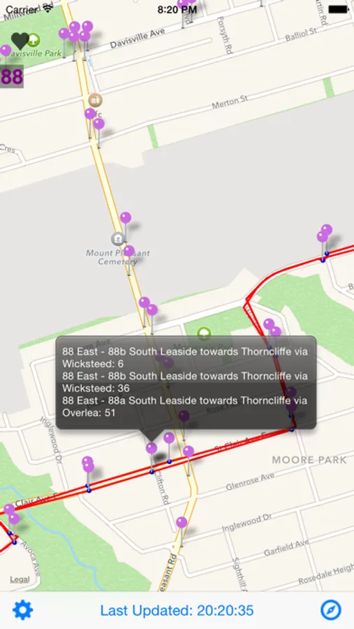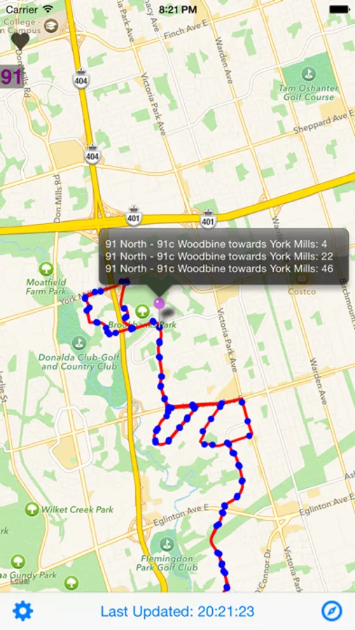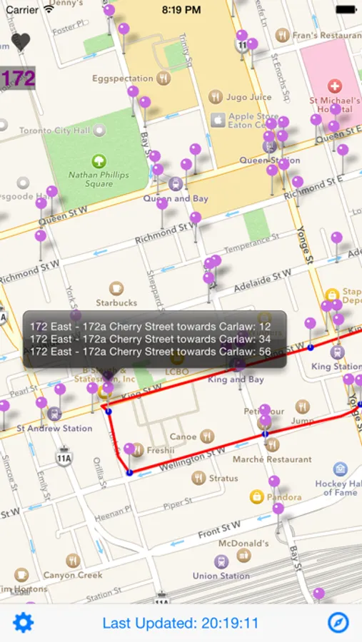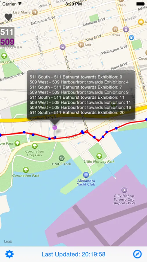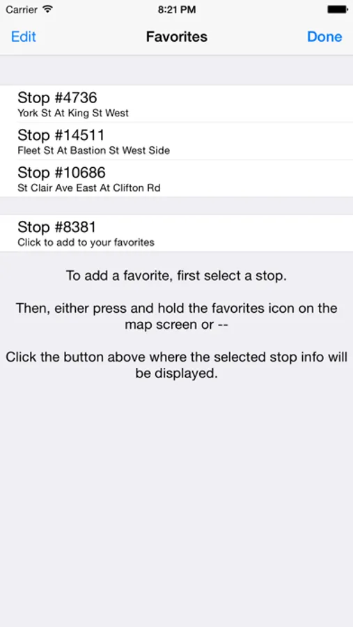 A simple, but straightforward, location based application that identifies Toronto bus stops with next bus predictions. Location can be determined by location services, or by your own map navigation. View routes and save favorite stops.