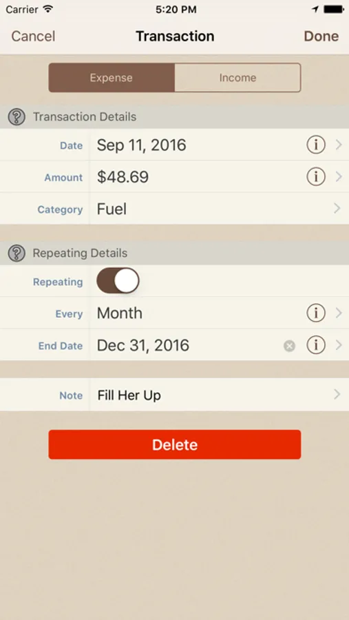 - repeat transactions daily, weekly or monthly (Pro Upgrade required)