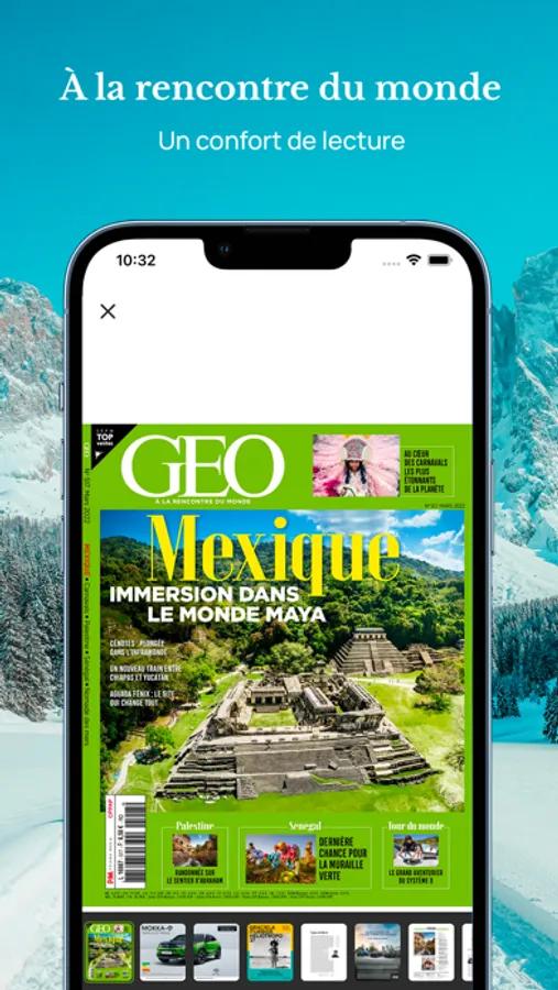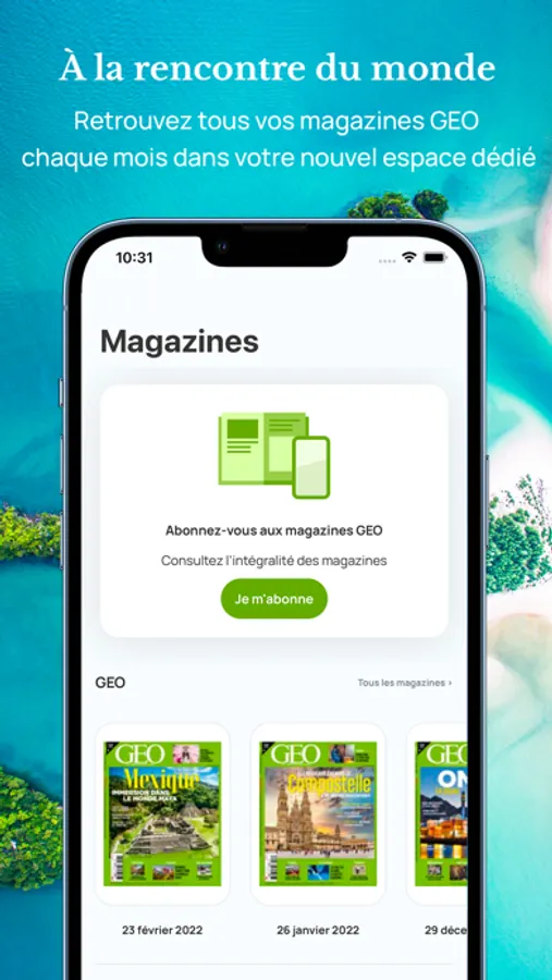 Avec le magazine GEO, partez, chaque mois, à la rencontre du monde. Photographies époustouflantes, reportages saisissants... GEO vous invite à (re)découvrir le monde avec plus de voyage, d'évasion et de rencontres inattendues.