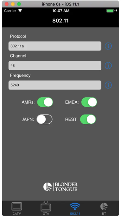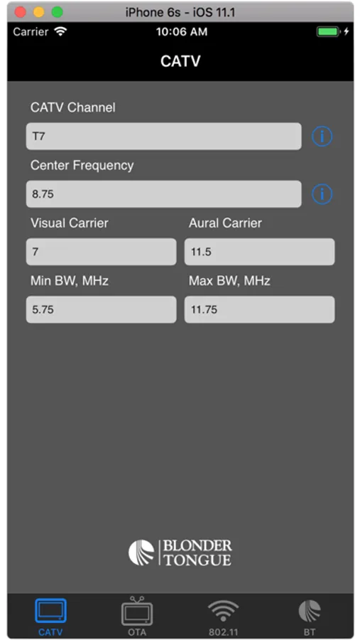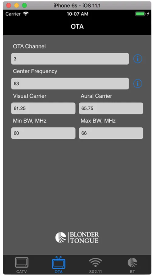 • Over the Air (OTA) Broadcast- Channel Number, Center Frequency, Visual Carrier, Aural Carrier, Bandwidth (Minimum and Maximum MHz)