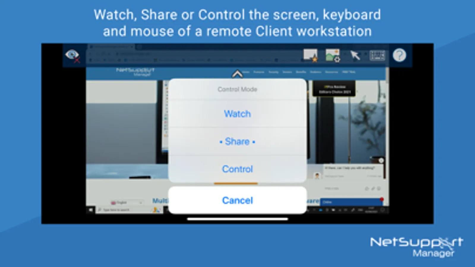 Remote Control – Watch (view only), Share (both parties can view and interact) or Control (remote screen and keyboard are locked) any NetSupport Manager-enabled remote PC.