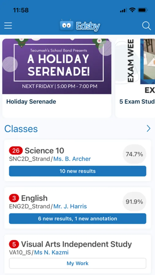 The Edsby app has many of the capabilities of the main Edsby web browser interface. Some complex features for certain types of users, such as the Edsby gradebook used by teachers, aren't available on devices with small screen sizes.