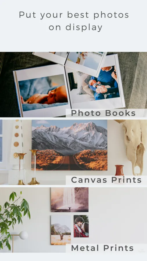 Transform your phone's images into special custom photo gifts or beautiful wall art! We made creating photo books, canvas prints, metal prints, and other photo products so quick and easy that anyone can do it. Our goal is to build an app that helps celebrate your favorite memories. Select the moments that make you smile and bring them to life with photo prints in a few simple steps.