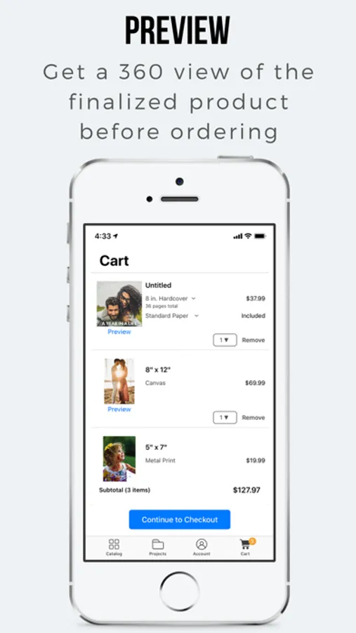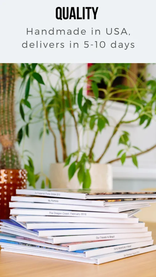 - Download our app, create a free account, select between our photo books, wall prints, or other photo products you want from the catalog, import your photos, make any customizations you desire, and submit your order.
