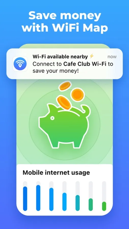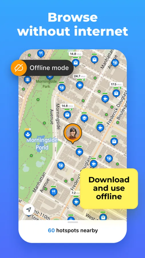 Always find a free WiFi hotspot around. WiFi Map will navigate you to the nearest shared hotspots, show passwords, and let you connect to the internet in a few taps.