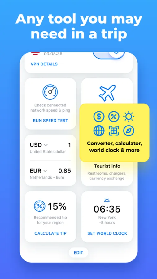 Meet small but useful widgets that contain all the information you may need while traveling. Find actual rates, calculate tips, keep an eye on the weather, and time from a single app.