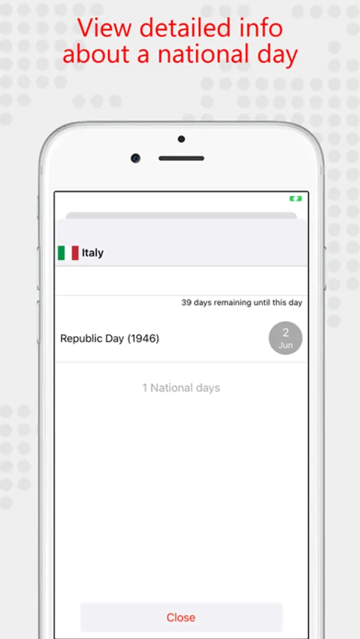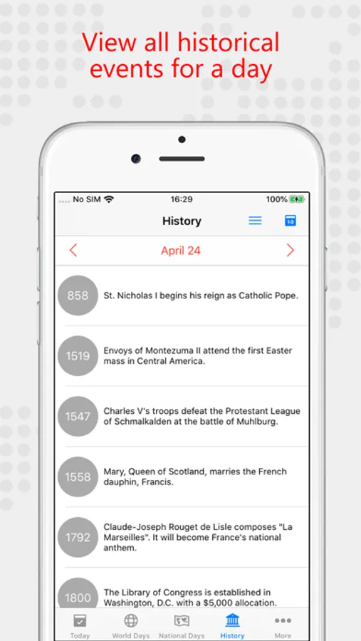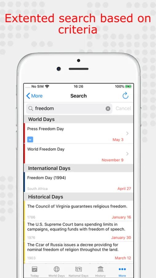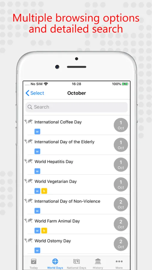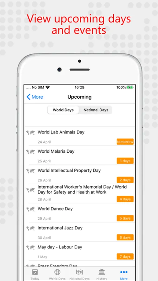 World Day includes a list of national days and anniversaries of 221 countries and religious observances for current year. Also using World Day you can view all historic events for a day.