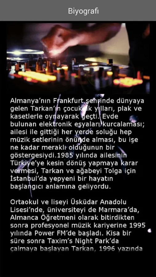 By downloading this application; you can listen all his albums and watch all videos of famous DJ Tarkan who is known all over the world. You can follow his Twitter feed, contact with him at any time you want, surf in his photo gallery and get information about most updated events and news about DJ Tarkan.