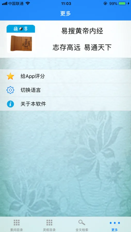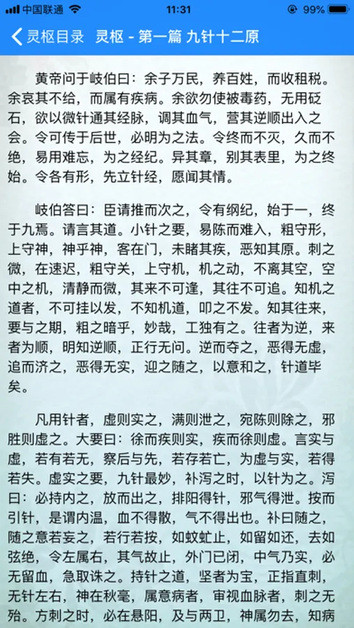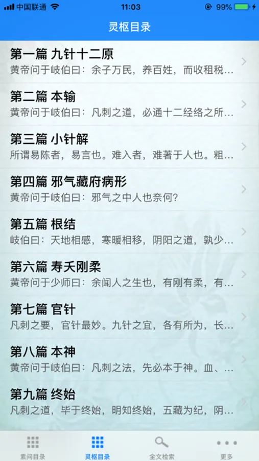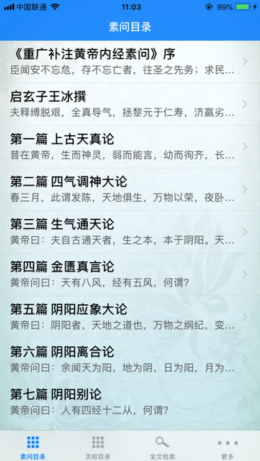本軟件從功能上包括黃帝內經素問目錄、靈樞目錄、全文檢索三個大的功能。其中,