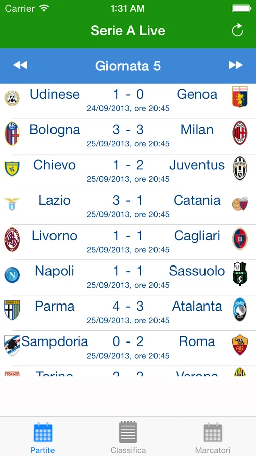 Con Serie A Live potrai tenere sotto controllo in diretta tutti i risultati della Serie A ,consultare la relativa classifica e consultare la lista dei marcatori.