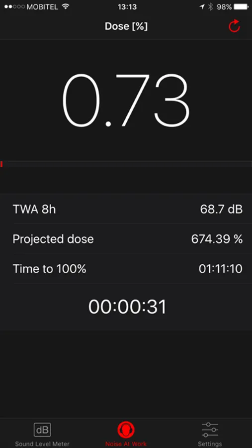 Occupational Health compliant parameters including: Noise DOSE, Elapsed time.