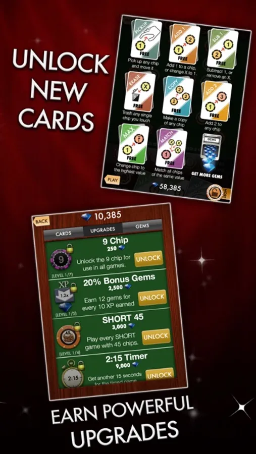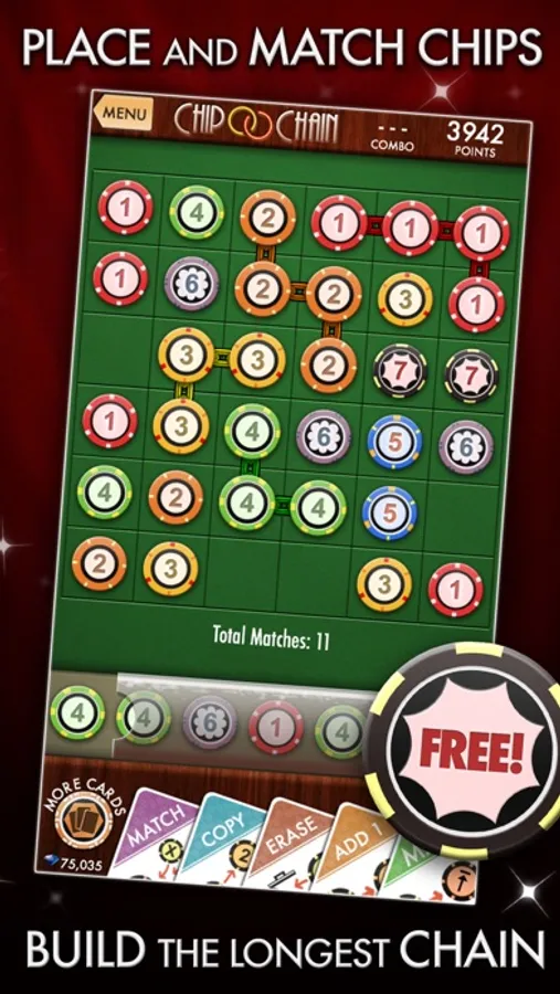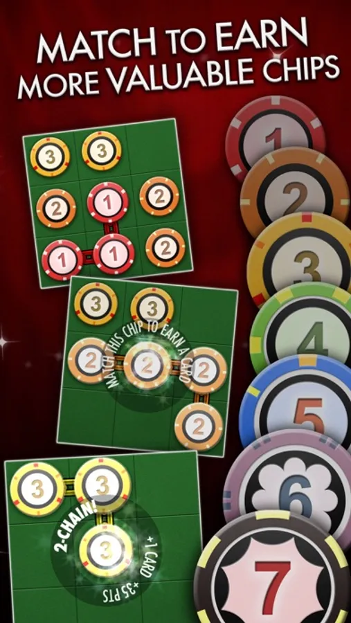 Place and match 3 or more identical poker chips to earn a more valuable chip, then chain together matches for huge bonuses! Play power-up cards to make combos, extend chains, and maximize your score. The dealer tosses chips to get in your way, but if you play smart and think ahead, you can turn the tables and use them to your advantage. Earn gems to spend on better chips, more powerful cards, bigger hands, gem multipliers, and more!