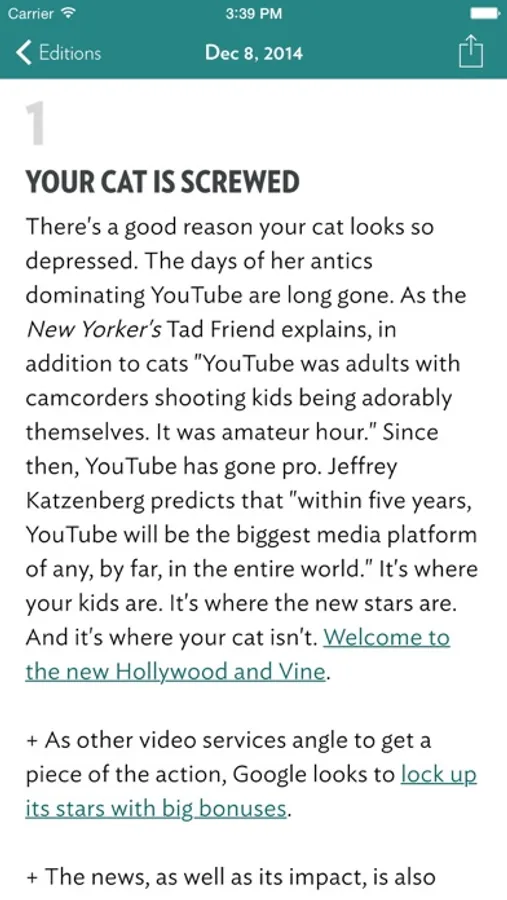 "A consistently informative and entertaining guide to some of the best stories on the web, with a healthy mix of news you should know, want to know, and prefer to pretend you didn't read." - Maria Konnikova, New Yorker