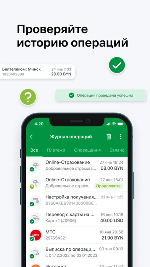 — Будьте в курсе движения денежных средств на Ваших карт-счетах с помощью уведомлений о приходных и расходных операциях.