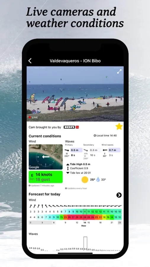 Always keep an eye on your favourite spots thanks to our HD live cameras. Plan ahead your next session, either if you intend to go in the next hour or on the weekend, by checking the current weather conditions and 10 day wind, wave and tide forecasts for your spot.