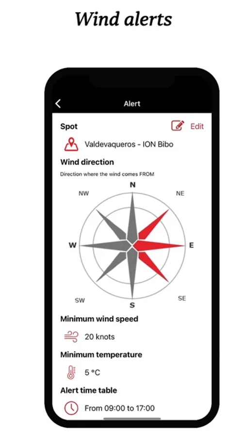 - Custom wind alerts: choose to get notified when your preferred weather conditions at your spots are met.