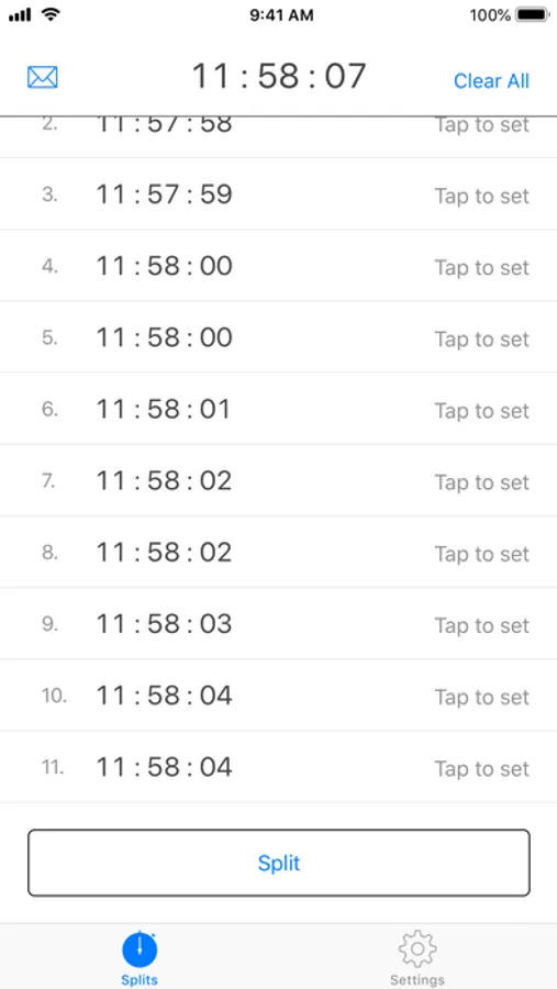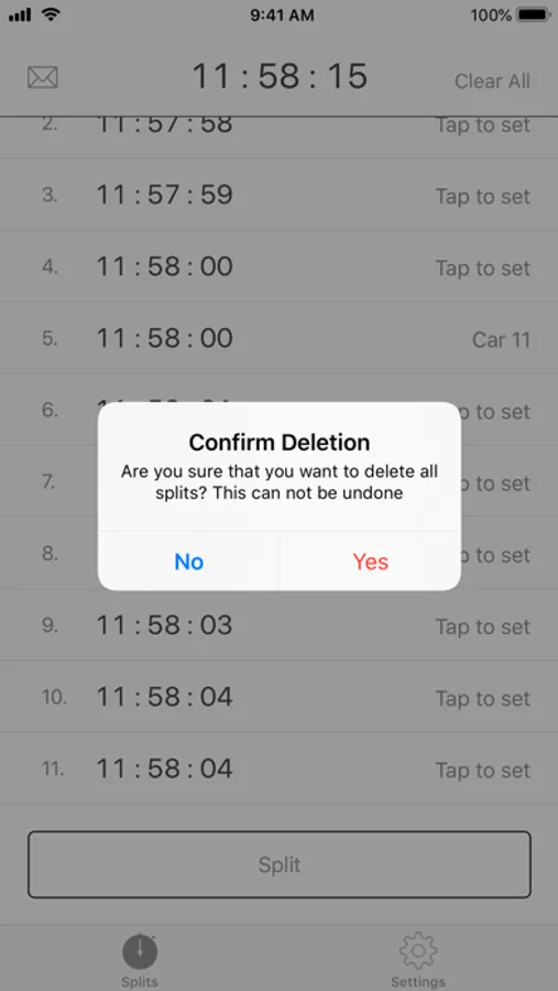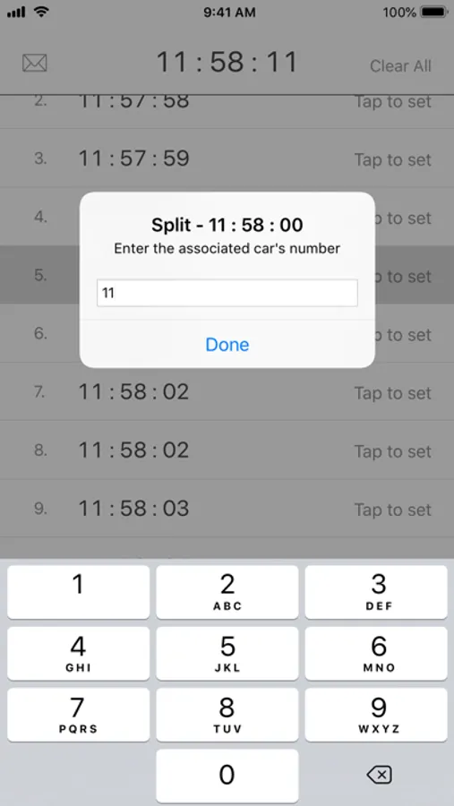 When the "Split" button is pressed the clock records the time of the split in a scrollable log area at the bottom of the display. An associated car number can optionally be recorded as well. Log entries can be reviewed by scrolling the screen and individual log entries may be deleted. The clock can be dynamically changed to record in seconds, tenths of a second, or hundredths of a minute (decimal minutes). A facility is provided to adjust the time of day clock independently of the devices clock so that the app can be synchronized to an external time reference without changing the device's clock.
