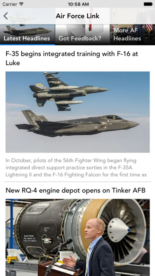 Up to the minute news from af.mil, Airman magazine, and the Air Force Live. Dynamic photos and video from around the Air Force.