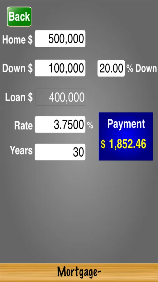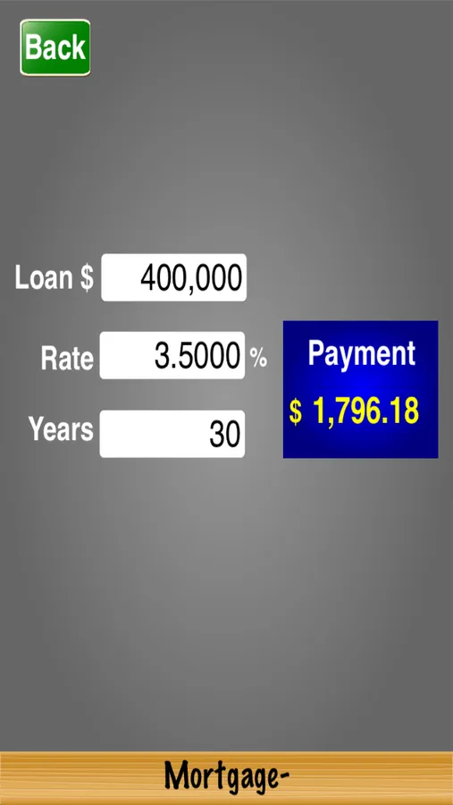 Mortgage- is a simple loan calculator that is easy to use. Select "Home Purchase" or "Refinance" to calculate the mortgage payment.